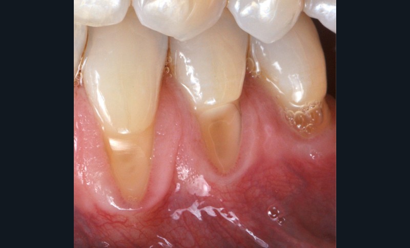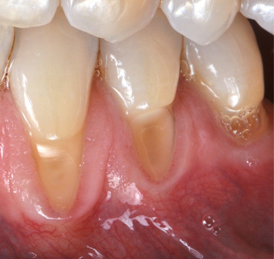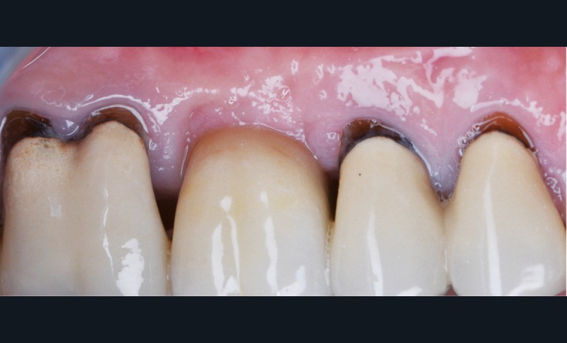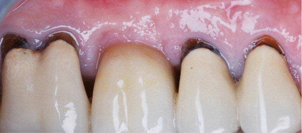 Zuchelli et coll. [1] définissent quatre causes à l’origine des récessions gingivales à la suite d’une déhiscence osseuse : les causes traumatiques (fig. 1) par le brossage, le surcontour prothétique, les piercings ; les causes bactériennes (fig. 2) liées à une inflammation marginale ; les causes virales par le virus de l’herpès simple ; et les origines mixtes, à savoir traumatiques et bactériennes (fig. 3). Le diagnostic de récession liée à la plaque dentaire dépend de la présence de dépôts tartriques et/ou d’inflammation des tissus environnant les zones exposées. En présence d’une origine mixte, la récession est d’abord initiée par un brossage traumatisant, rendant la surface radiculaire hypersensible ou irrégulière, ayant une répercussion négative sur le brossage et l’accessibilité à l’hygiène.