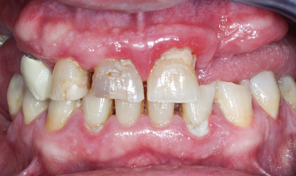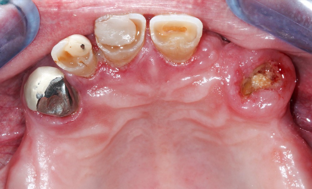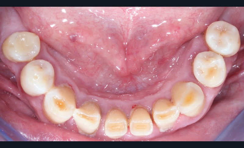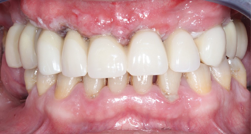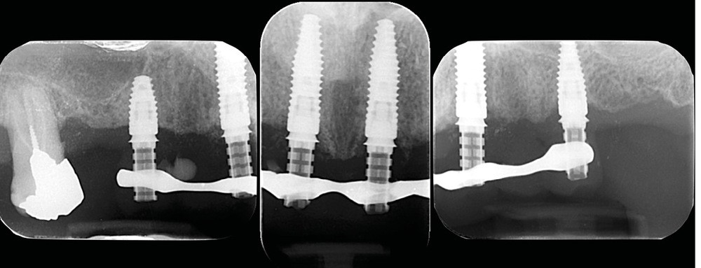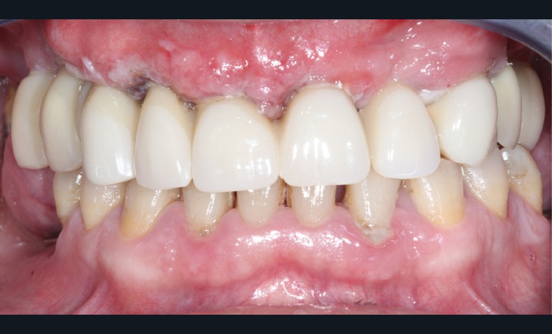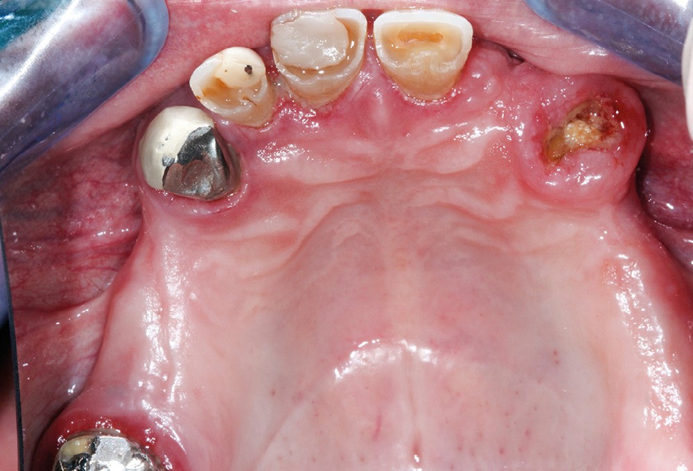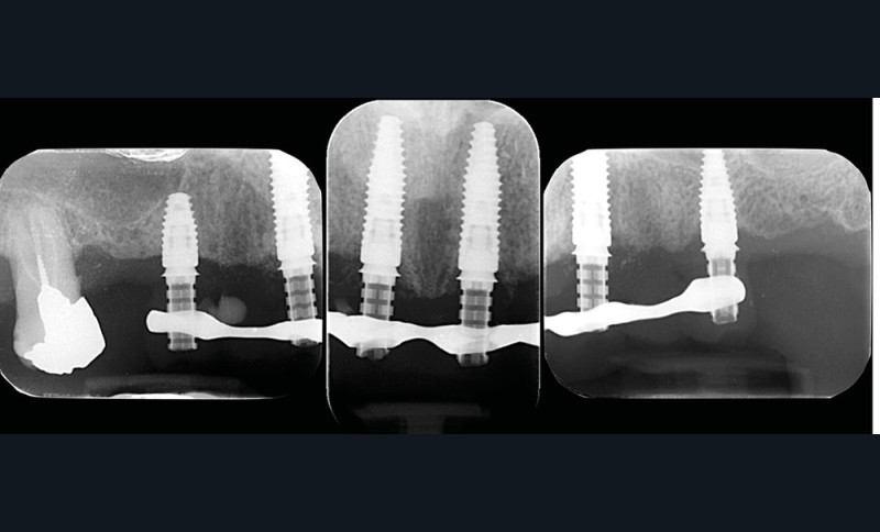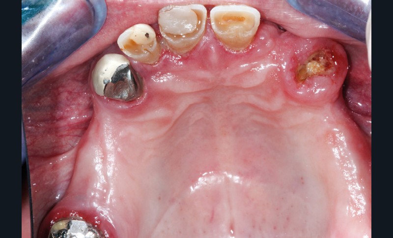 Le patient a été satisfait de l’immédiateté et du confort de la restauration provisoire, mais n’a malheureusement pas poursuivi son traitement et n’est venu consulter que quelques années plus tard, avec des répercussions prévisibles et néfastes. L’absence de calage molaire, l’hygiène déficiente (aucun passage de brossette dans les embrasures) et une absence de suivi au cabinet ont entraîné une inflammation très importante des tissus péri-implantaires (fig. 8…