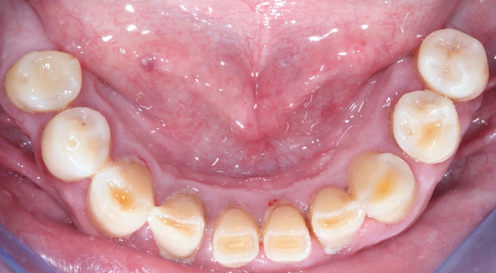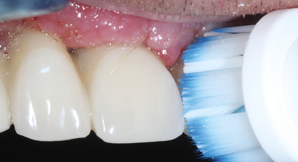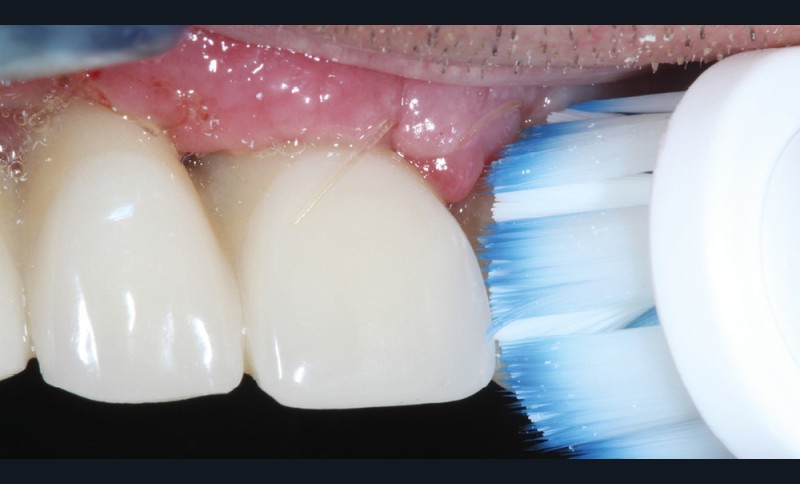 La réhabilitation bi-maxillaire est envisagée selon le concept de l’arcade courte, intéressant jusqu’aux premières molaires. La prise en charge a débuté par une motivation à l’hygiène, et une explication des techniques de prophylaxie, avec notamment la remise d’une brosse à dents électrique et des têtes de brosses adaptées et des brossettes interdentaires de tailles différentes (fig. 7).