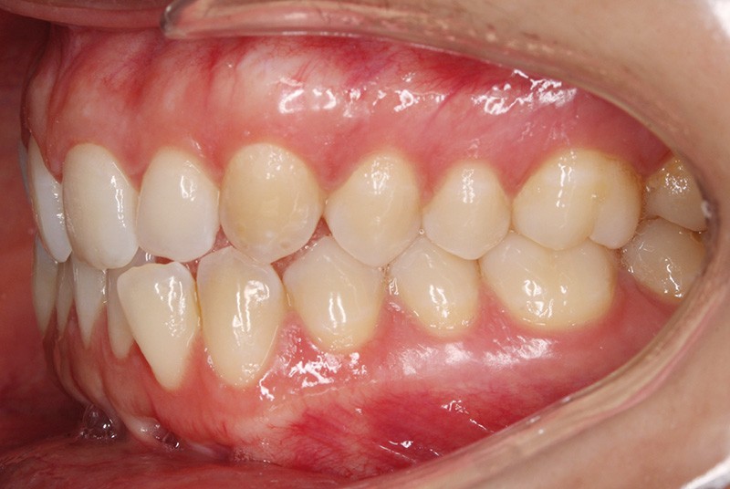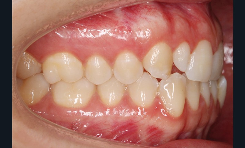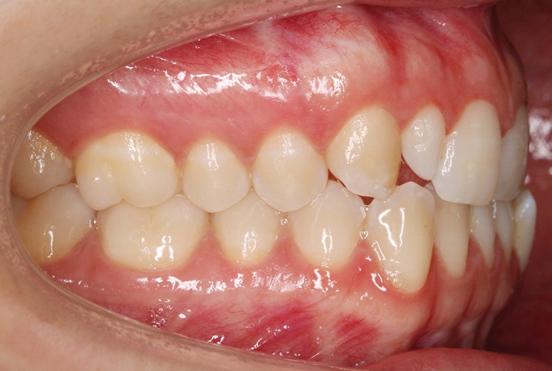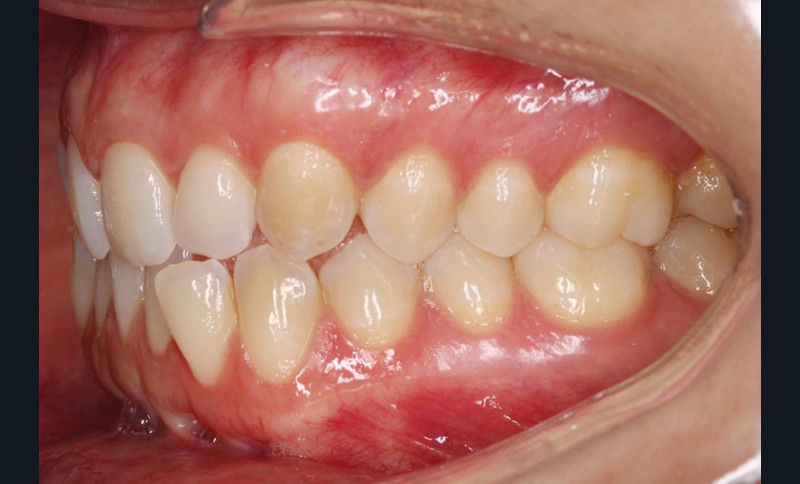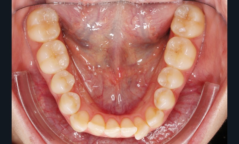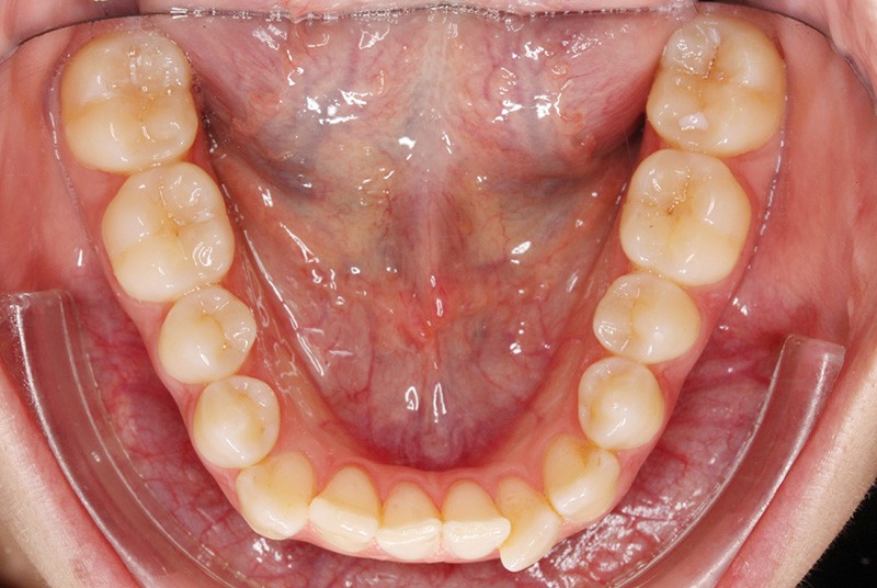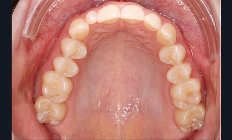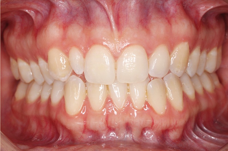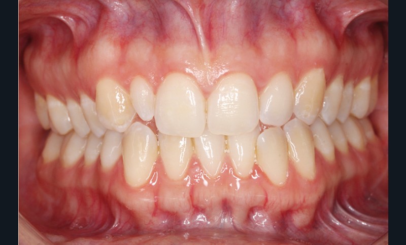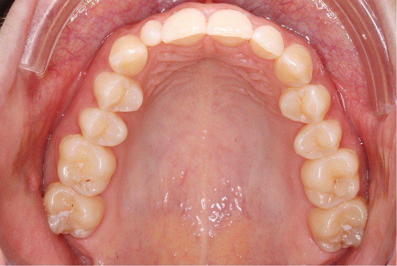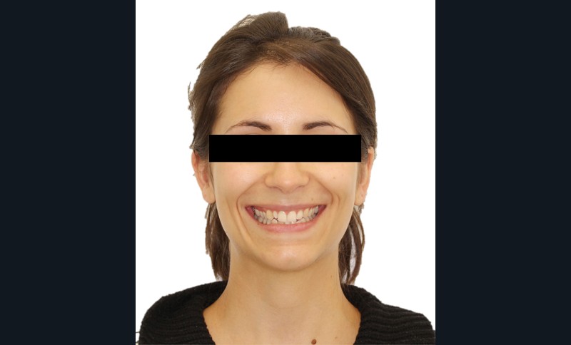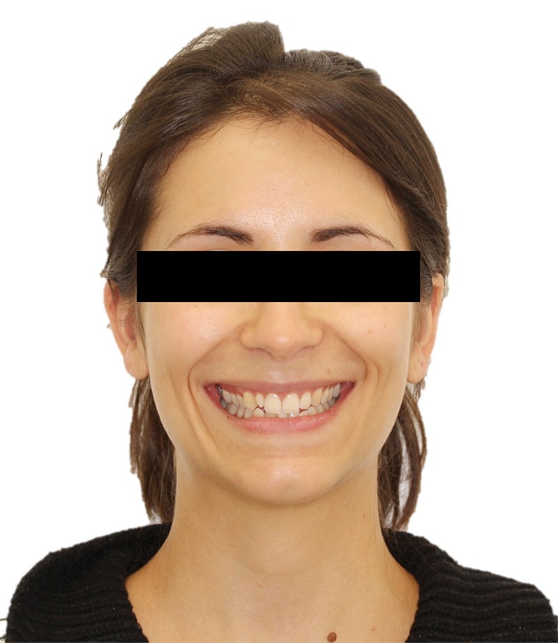 Elle présente une classe I dentaire en denture adulte. Son sourire est perturbé, notamment par la microdontie de son incisive latérale maxillaire droite (la 12). On constate un encombrement modéré au maxillaire (bimarginotopie mésio-palatine et disto-vestibulaire de 13) et plus marqué à la mandibule (monomarginotopie mésio-vestibulaire de 32 et de 43) (fig. 1-6).