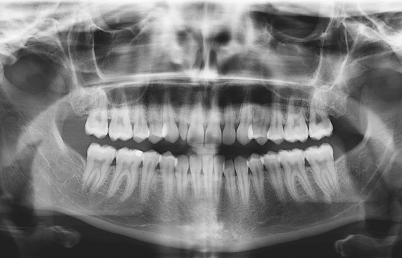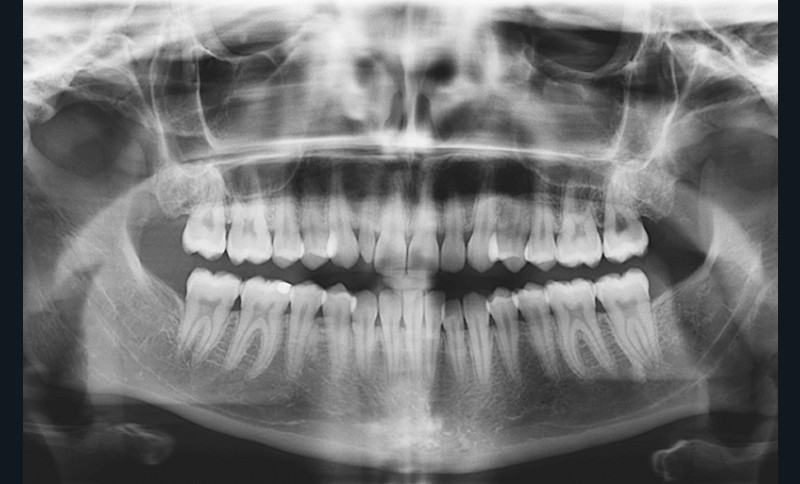 La radiographie panoramique révèle la présence de toutes les dents définitives, à l’exception des dents de sagesse, extraites (fig. 7).
