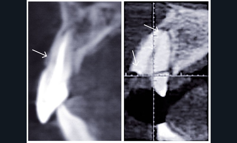 Evalués lors de l’examen clinique, ils orienteront le choix de la thérapeutique la plus appropriée à la situation clinique rencontrée. Les travaux de Braut et coll. (3) révèlent ainsi l’importance de l’épaisseur de la paroi alvéolaire vestibulaire en regard de l’édentement dans le choix thérapeutique. Il est judicieux de s’assurer rapidement de sa présence et de mesurer son épaisseur par un examen radiographique de type cone-beam (fig. 1). Trop fine, moins de 1 mm d’épaisseur, elle demandera un comblement osseux préalable, ou conjointement, à la mise en place d’un implant (4).