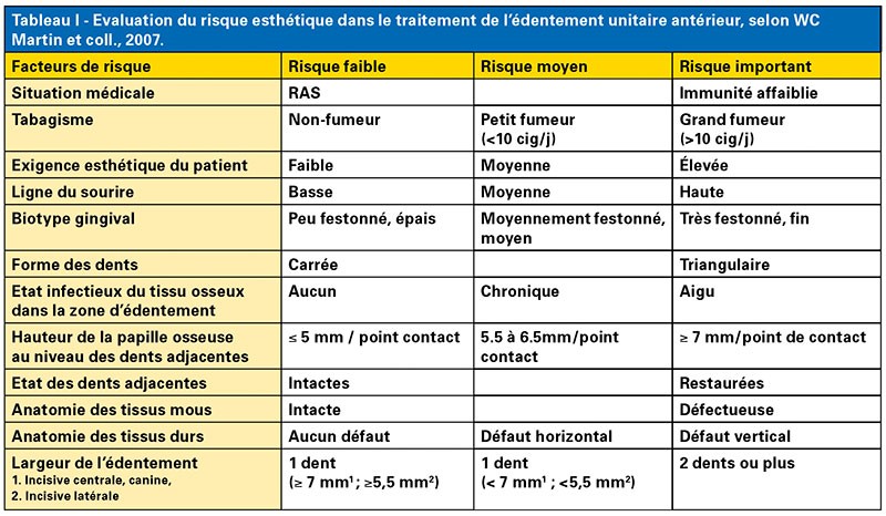 Avant toute réhabilitation prothétique des secteurs antérieurs, il est essentiel d’évaluer les facteurs de risque esthétique qui sont clairement définis dans la littérature (9) (tableau 1).