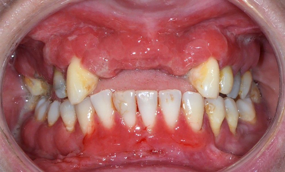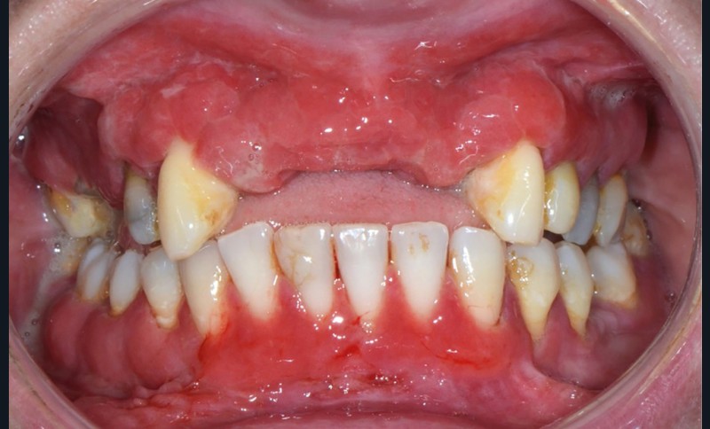 Au niveau muqueux, une large plage érythémateuse s’étend à la mandibule et au maxillaire, sur toute la hauteur de gencive attachée et marginale des secteurs dentés ainsi que sur les crêtes édentées et la fibromuqueuse palatine, à l’exception du raphé médian. La gencive est œdématiée, « bourgeonnante », et saigne au moindre contact.