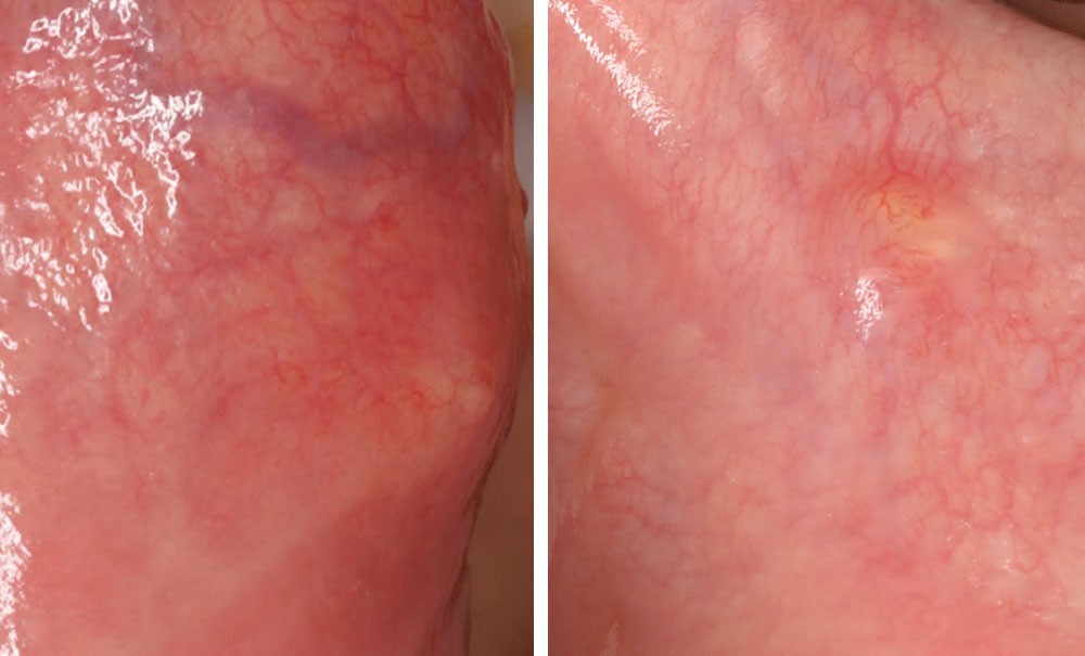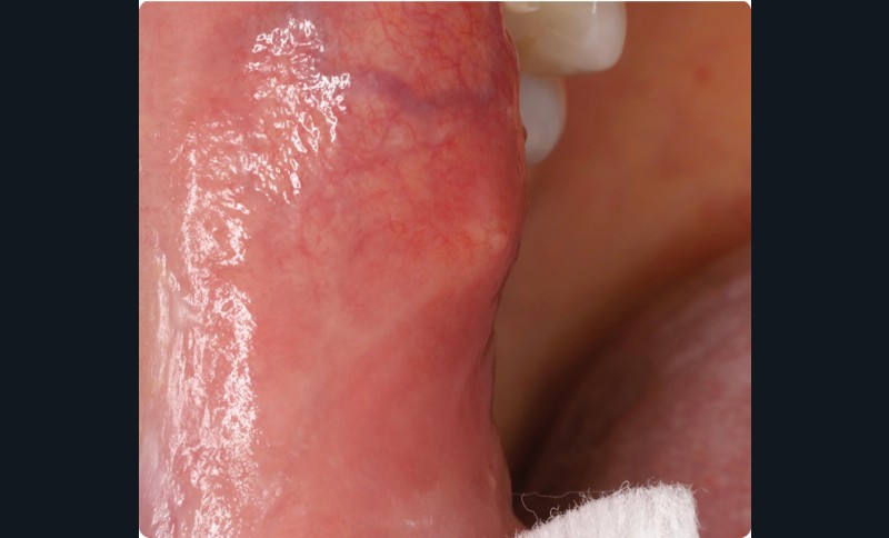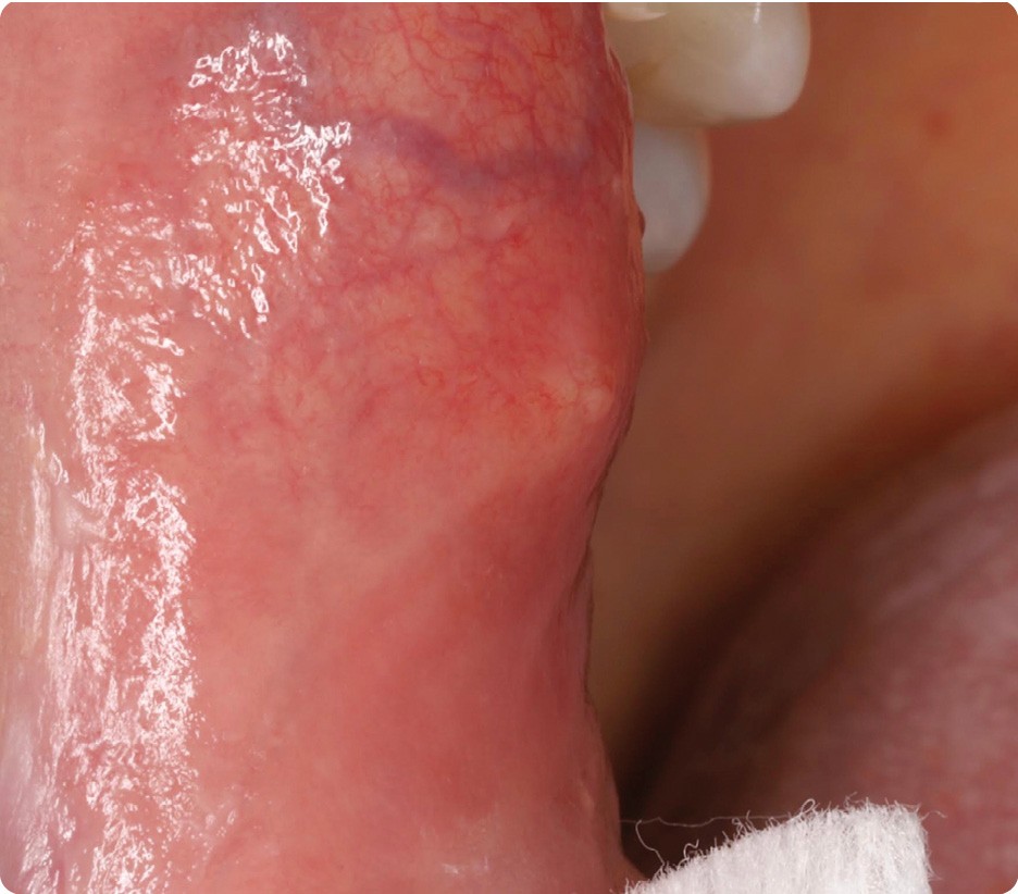• La patiente était suivie depuis plusieurs années pour une kératose idiopathique occupant la presque totalité de la face ventrale gauche de la langue où elle avait développé successivement trois foyers d’OIN (Oral Intraepithelial Neoplasia) de haut grade. Elle présentait aussi une polykystose rénale associée à des kystes hépatiques ; la polyskystose, qui évoluait vers une insuffisance rénale, avait nécessité deux hospitalisations pour douleurs et hématuries.