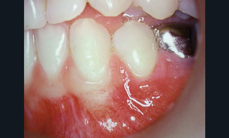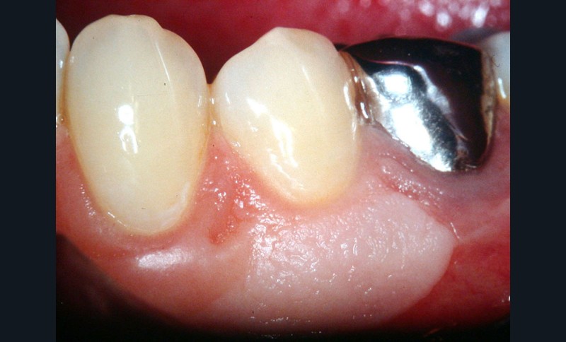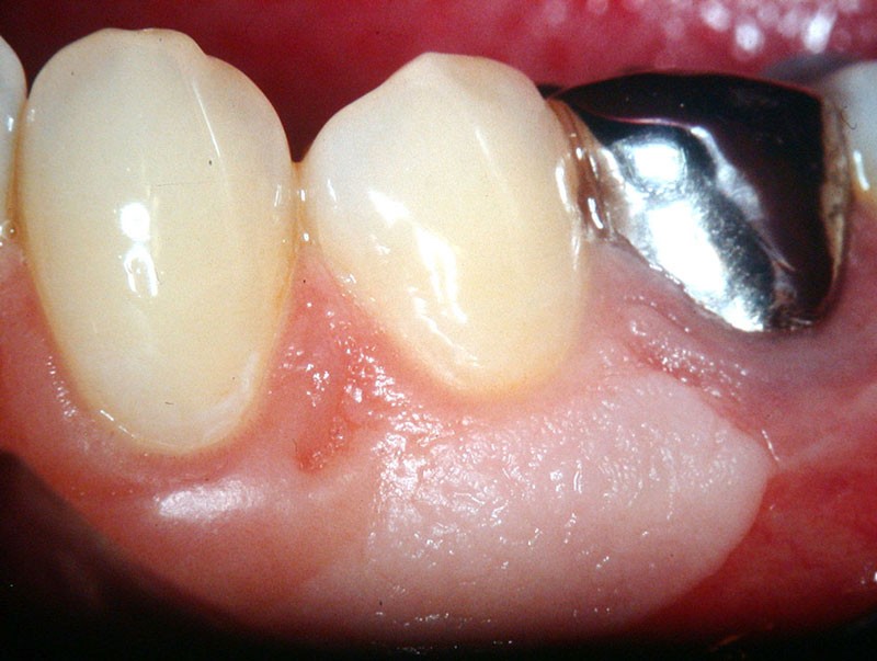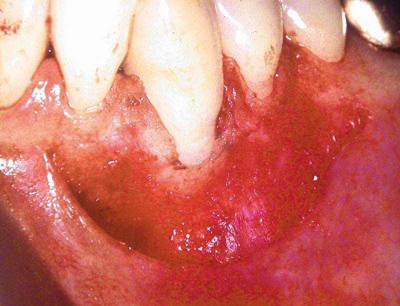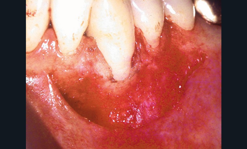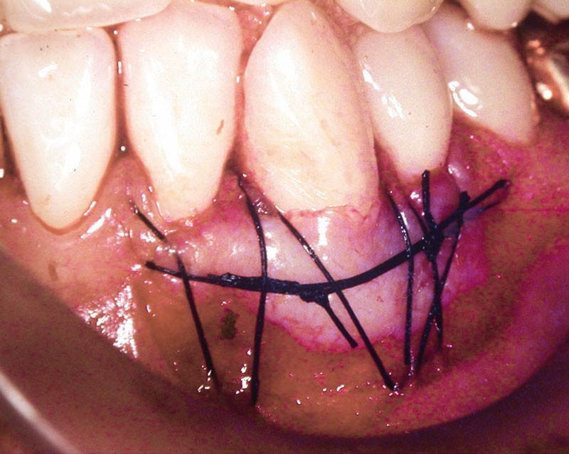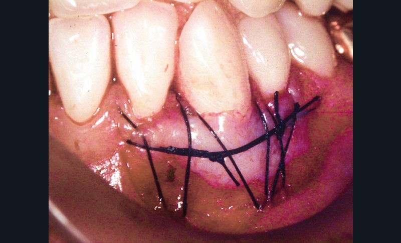Cette absence de gencive attachée peut prédisposer à la formation d’une récession gingivale. Une greffe épithélio-conjonctive est réalisée. Elle permet d’obtenir un lambeau de gencive attachée kératinisée stable (fig. 2).