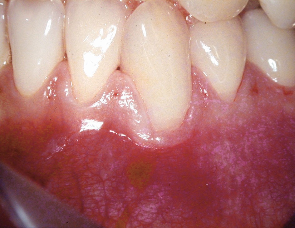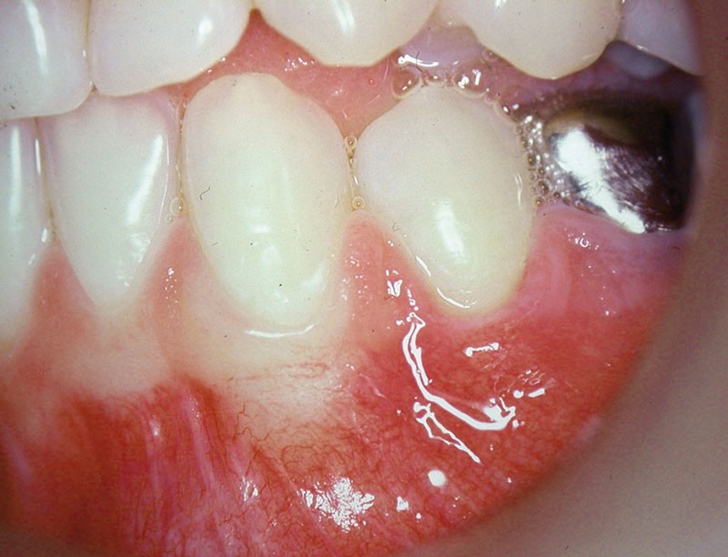 Dans ce deuxième cas, la canine mandibulaire présente également une absence de gencive attachée, associée ici à une récession gingivale (fig. 3).