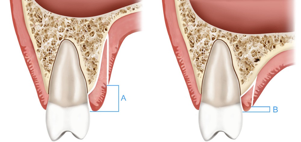 Lors de l’élimination du tissu parodontal, il est primordial de respecter l’espace biologique, désormais nommé « attache supra-crestale » [1]. Distance comprise entre le fond du sulcus dentaire et le sommet de la crête osseuse, elle varie de 2 à 5 mm en fonction des patients et du type de dents. Après une chirurgie, il faut compter six mois pour que l’attache supra-crestale cicatrise et se stabilise à sa dimension initiale préopératoire.