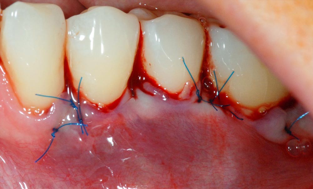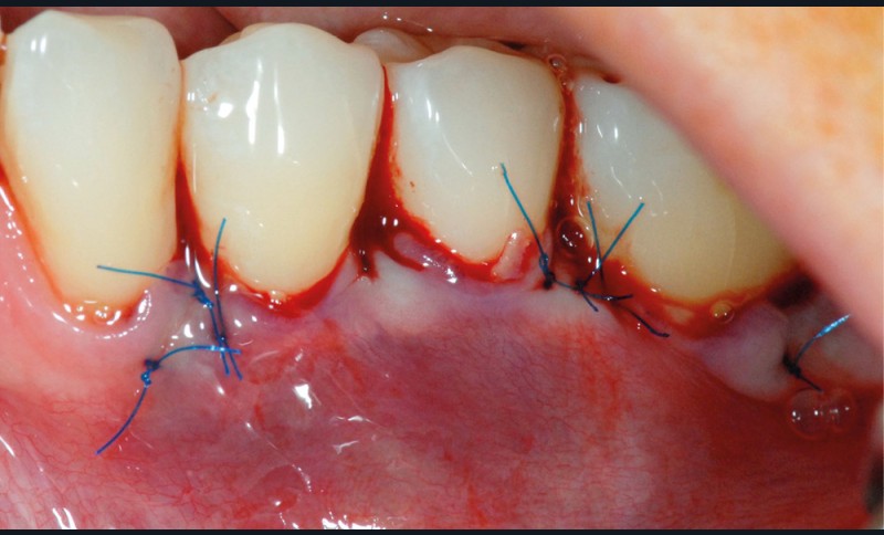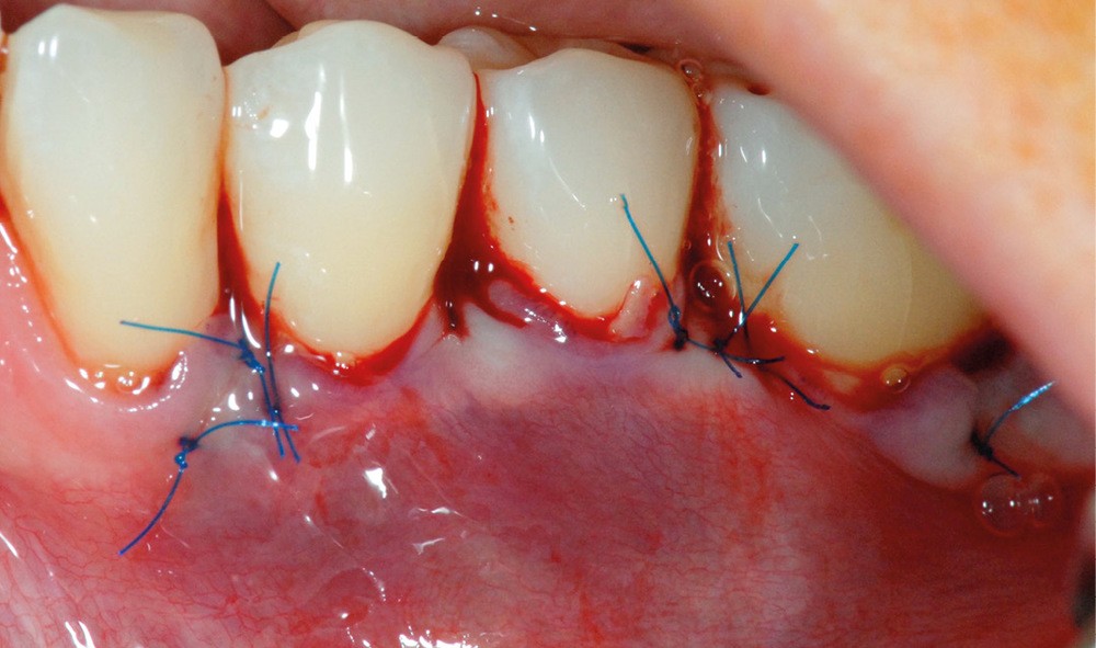 Cette technique permet de recouvrir des récessions gingivales contiguës par une traction coronaire après une dissection partielle superficielle au-delà de la ligne muco-gingivale. Grâce à un jeu d’incisions des papilles, les incisions de décharge ne sont pas nécessaires. Un greffon conjonctif prélevé au palais selon la technique de l’enveloppe [3] est placé sur les récessions et suturé en même temps que le lambeau par des points suspendus [4].