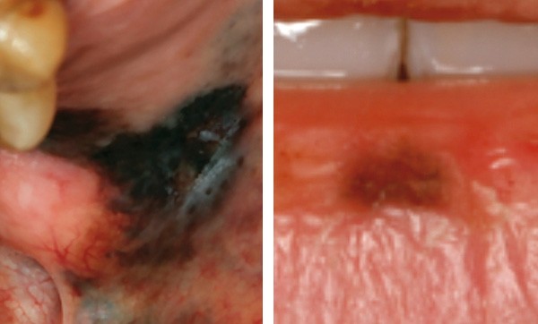 Motif de la consultation. Patient de 71 ans venu consulter sur les conseils de son chirurgien-dentiste après la découverte d’une macule noirâtre lors d’un examen de contrôle systématique.