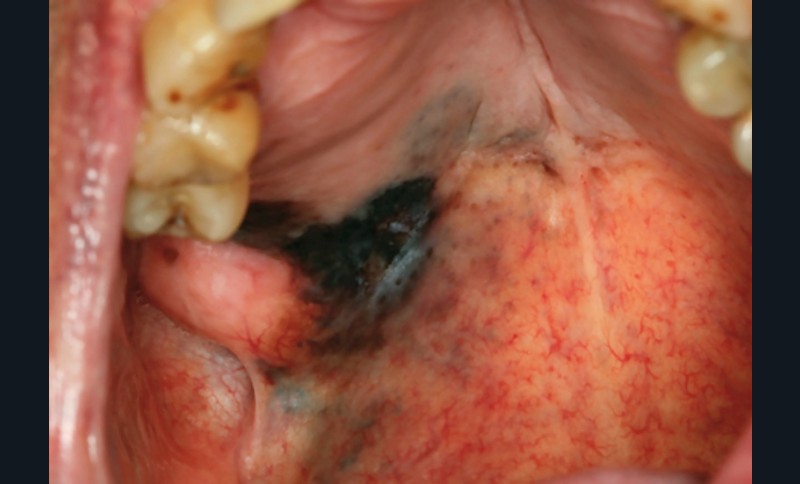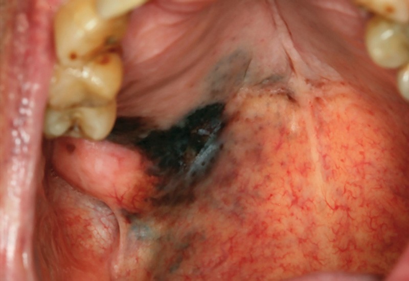 Examen clinique. La muqueuse buccale avait un aspect normal, excepté dans la région postéro-supérieure droite. Sur la jonction palais dur-palais mou, on observait une large macule constituée pour moitié par une plage noirâtre homogène, assez bien limitée, avec en périphérie des plages grisâtres, de tonalité variable, ayant des limites irrégulières souvent imprécises. Il n’y avait pas d’adénopathies cervicales palpables.