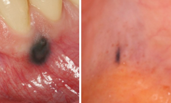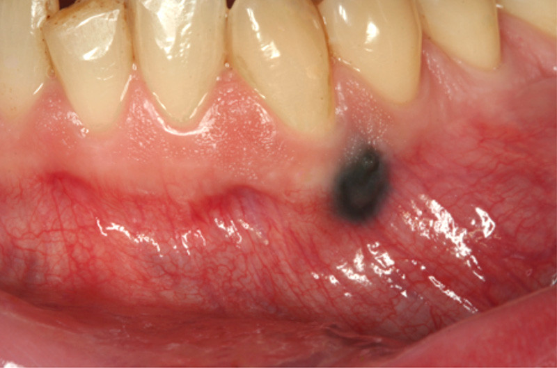 Examen clinique. On observait une macule noirâtre, à surface plane, arrondie, de 5 mm de diamètre, à limites nettes, qui siégeait à cheval sur la gencive attachée et la gencive libre, à hauteur de la dent 33. Les limites étaient nettes et régulières, et la teinte presque homogène. Il n’y avait pas d’autre lésion cutanéo-muqueuse.