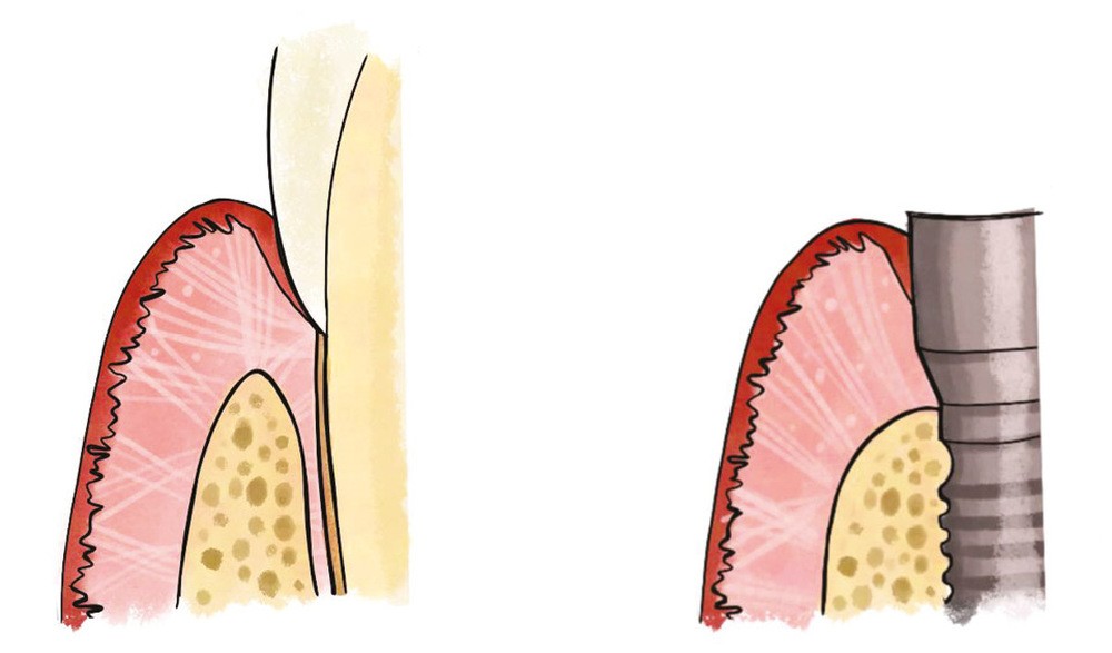 Les tissus péri-implantaires ont une organisation qui diffère de l’espace biologique de la dent. L’attache épithéliale présente une structure similaire à l’épithélium dentaire avec un sulcus considéré comme sain à 4 mm. L’attache conjonctive diffère, puisque les fibres de collagènes seront parallèles à l’axe de l’implant et perpendiculaires à l’os crestal. Il n’existe bien évidemment ni cément, ni ligament alvéolo-dentaire ce qui entraîne une différence majeure au niveau de la vascularisation. Elle provient du périoste et sera donc moins importante que pour les tissus parodontaux [5, 6] (fig. 1).
