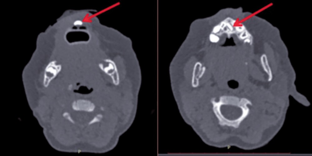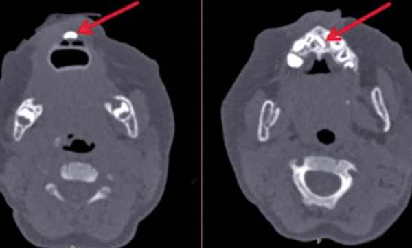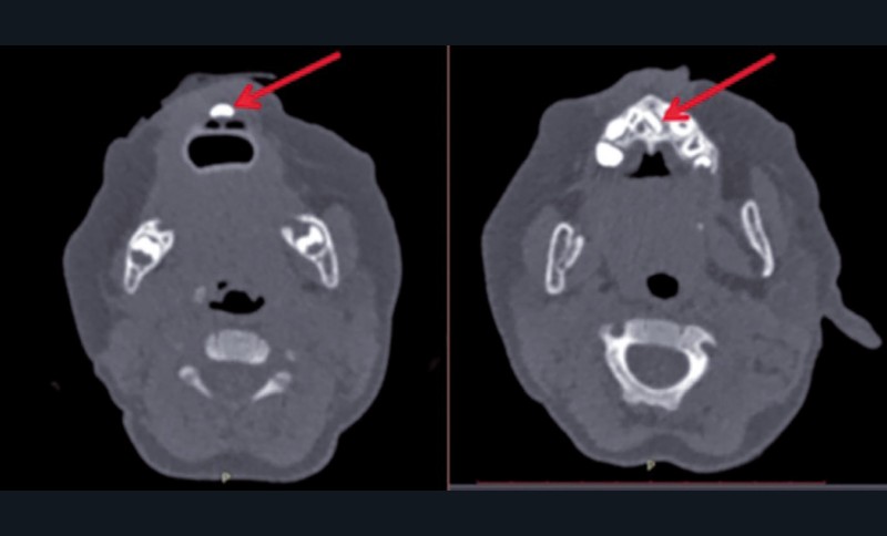 Un scanner, précédemment réalisé à la demande du pédiatre, objective une formation dentaire médiane ainsi que la présence d’un germe unique et médian d’incisive centrale permanente (fig. 3). En outre, il permet d’écarter l’hypothèse d’une fente palatine sous-muqueuse ou d’une sténose des orifices piriformes.