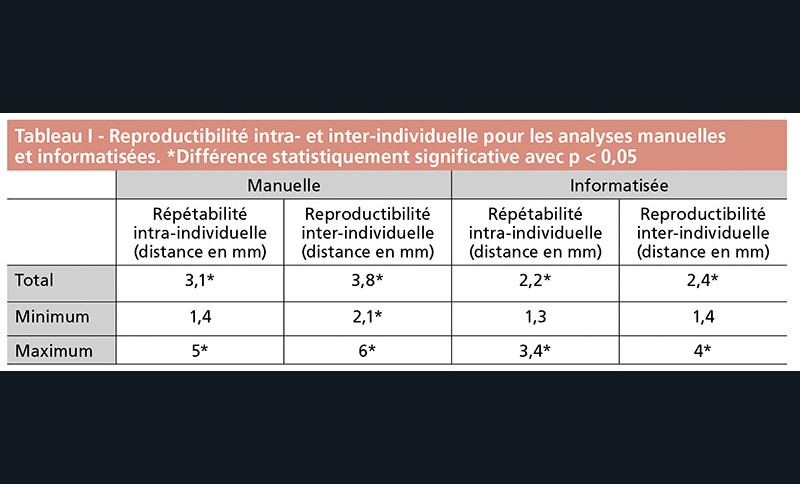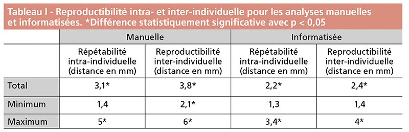 En moyenne, 3,7 mm séparent chaque point du réseau entre une analyse manuelle et une analyse informatisée. La distance séparant chaque point du réseau construit à deux reprises par le même opérateur passe d’une valeur de 3,1 mm pour la méthode manuelle à 2,2 mm pour la méthode informatisée. La distance séparant chaque point construit par deux opérateurs différents passe de 3,8 mm pour la méthode manuelle à 2,4 mm pour la méthode informatisée. Le temps moyen de réalisation d’une analyse manuelle est de 20’ 46” par opposition à une durée moyenne de 2’ 19” pour l’analyse informatisée.