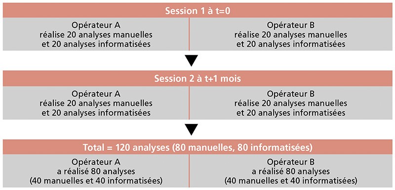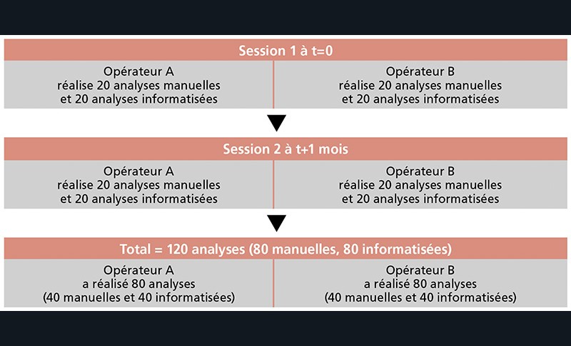 20 téléradiographies de profil ont été analysées de façon manuelle et informatisée par deux opérateurs lors de deux sessions. Les temps nécessaires aux implémentations manuelle et informatique ont été relevés. Les distances séparant les coordonnées des 36 points d’intersection de la grille ont été analysées à l’aide de tests de Student. Les reproductibilités intra- et inter-opérateur ont été évaluées à l’aide de coefficients de corrélation.