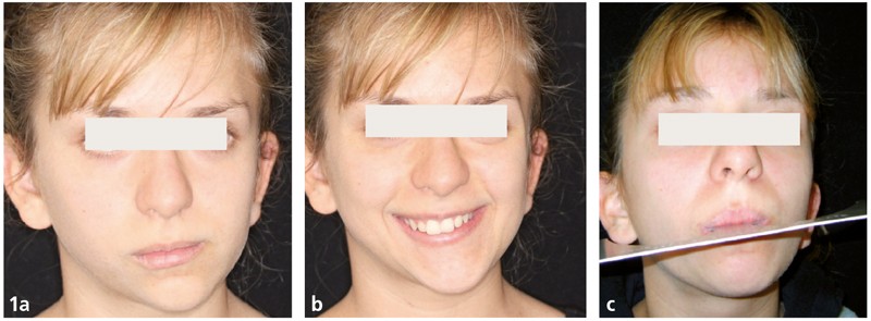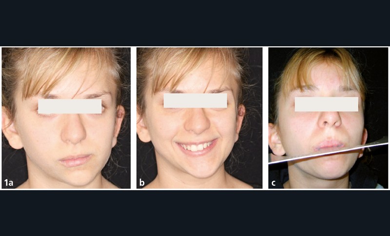 Analyse esthétique : la patiente présente une asymétrie faciale (fig. 1a et b) associée à un profil convexe. Son sourire est disgracieux par son obliquité (fig. 1c).
