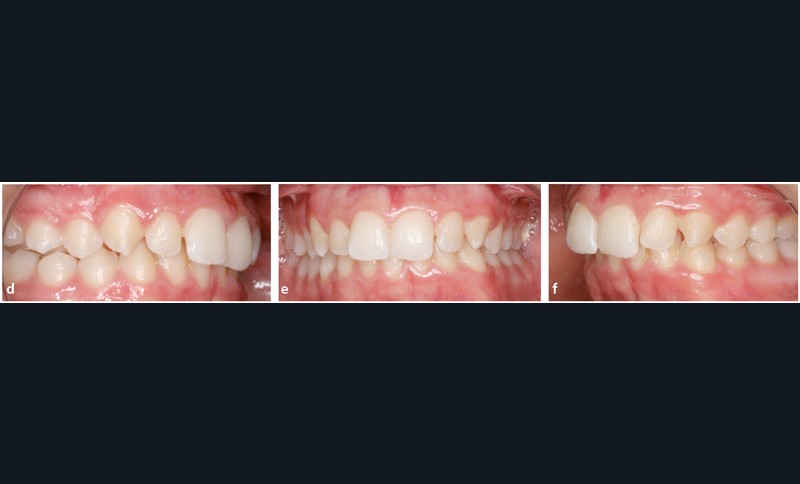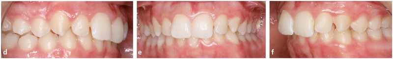 Analyse dentaire : les arcades dentaires sont asymétriques avec une Classe II molaire et canine mais plus importantes à gauche (fig. 1d, e et f).