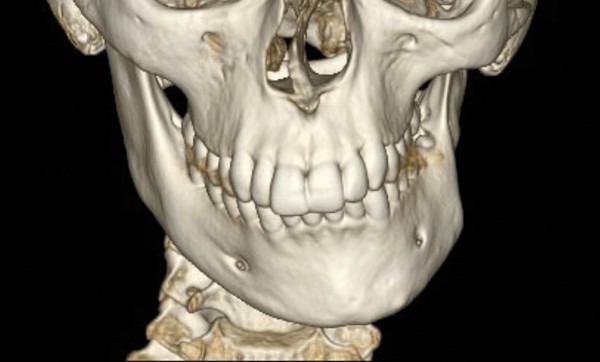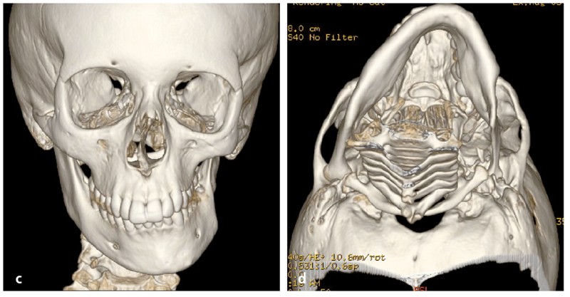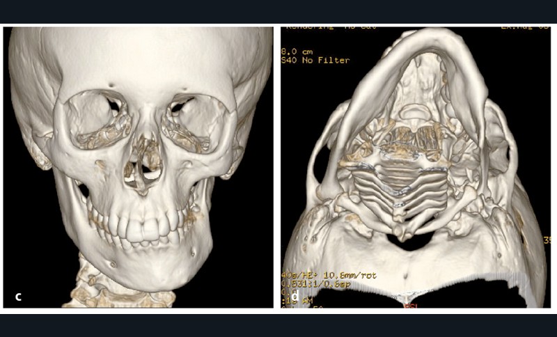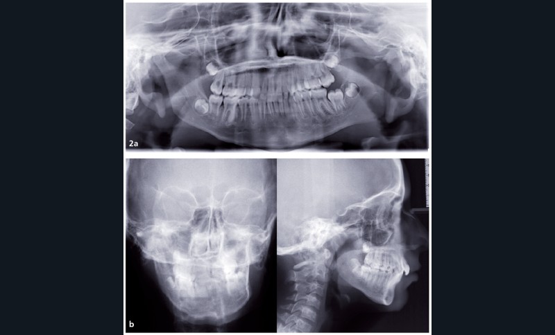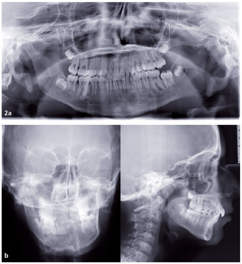 Analyse squelettique : les documents montrent une classe II squelettique modérée par rétrognathie mandibulaire dans un contexte de normodivergence. Les examens complémentaires confirment que la latérognathie mandibulaire gauche est la conséquence d’un hypo-développement des structures maxillaires et mandibulaires de ce même côté (fig. 2a, b et c). On observe sur les reconstructions 3D (à partir des coupes scanner) à l’aide du logiciel Osirix® : un corps mandibulaire fin, un ramus peu développé, un col du condyle grêle.