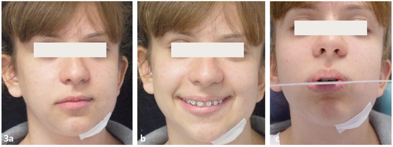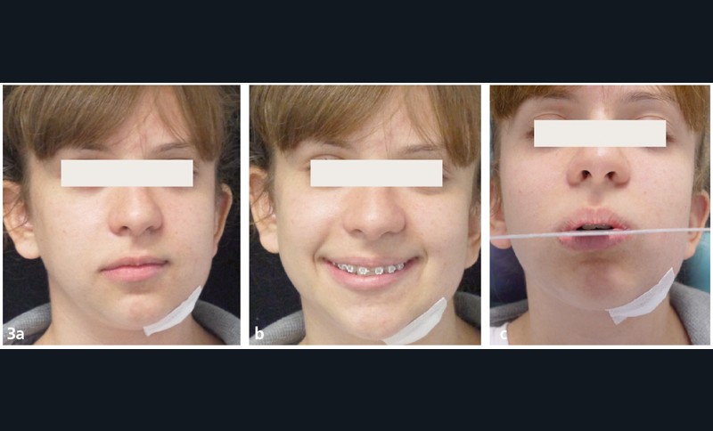 T + 1 mois : la patiente est déjà très heureuse du résultat obtenu avec le repositionnement du menton et un sourire plus horizontal (fig. 3a et b). Le plan de Fox matérialise la correction du plan palatin (fig. 3c).