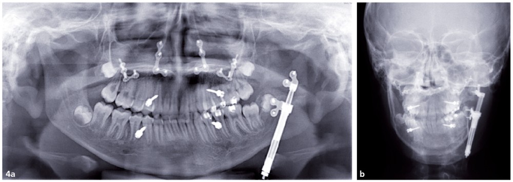 Les examens de contrôle montrent la position du distracteur et la quantité de tissus néoformés (fig. 4a et b).