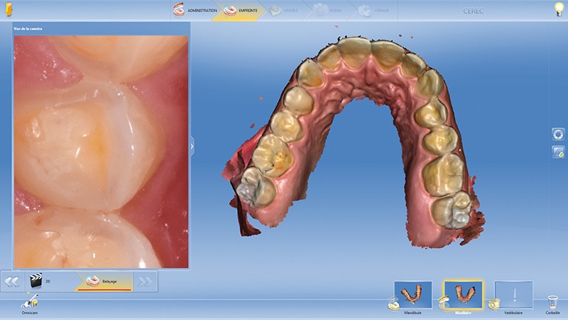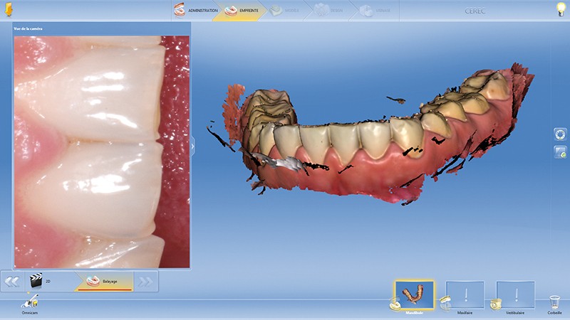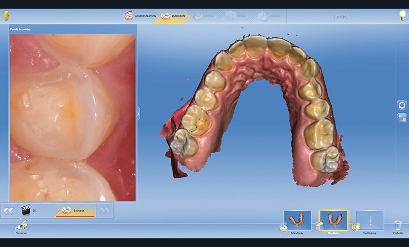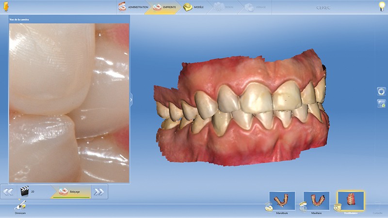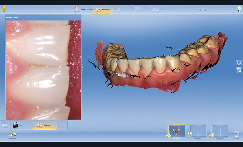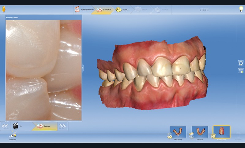 La première étape consiste en la réalisation d’empreintes optiques (fig. 1a à c) des deux arcades du patient complétées par un balayage des faces vestibulaires permettant d’enregistrer la position des arcades en Occlusion d’Intercuspidie Maximale (OIM).