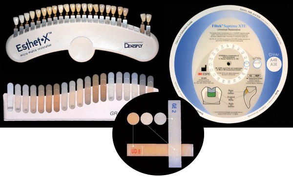 La plupart des marques de composites fournissent des nuanciers qui sont censés correspondre aux résines composites utilisées en bouche une fois polymérisées.