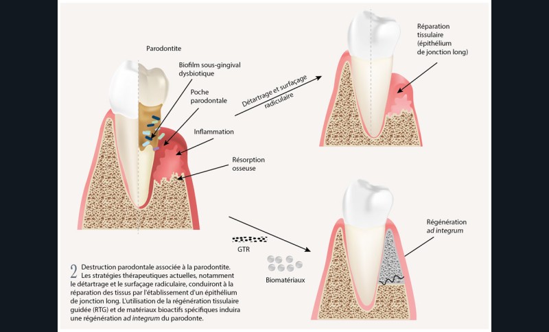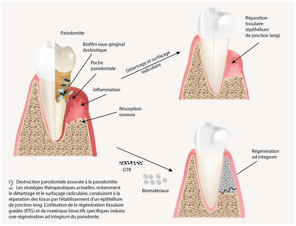 Actuellement, le traitement parodontal consiste en une phase non chirurgicale (instrumentation sous-gingivale) associée ou non à un traitement adjuvant tel que l’utilisation d’antibiotiques ou d’antiseptiques. En cas de progression plus avancée de la maladie, une approche chirurgicale peut être nécessaire [4]. Cependant, dans la majorité des cas, une réparation du tissu lésé caractérisée par un épithélium de jonction long est obtenue, et non une régénération ad integrum du parodonte [5] (fig. 2).