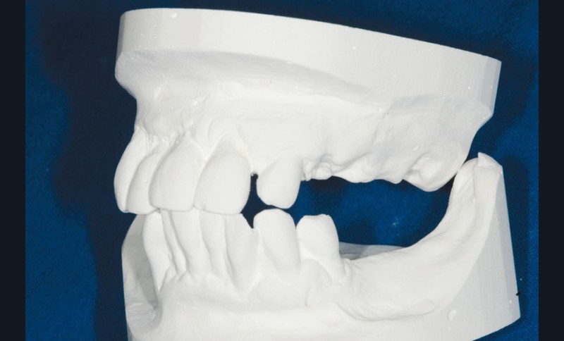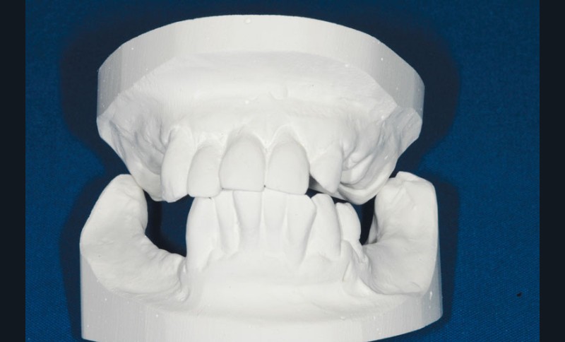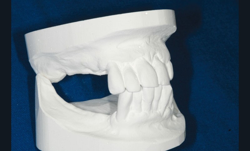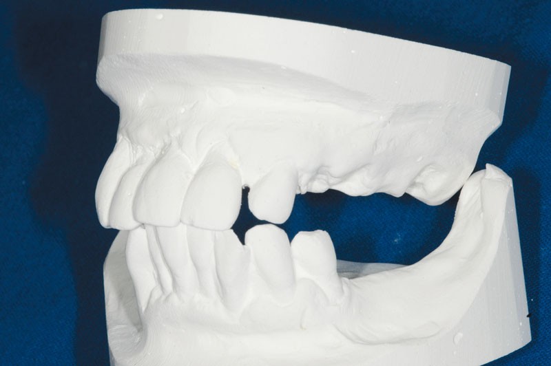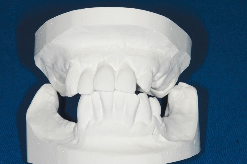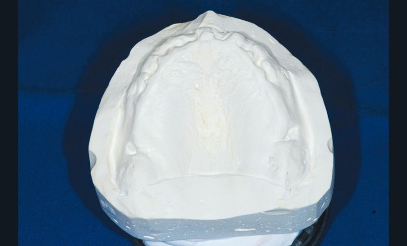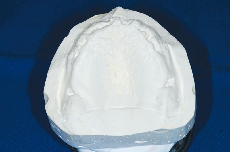 Pour ce faire, après extraction des dents postérieures non visibles, le praticien a effectué deux empreintes primaires. Sur les modèles en plâtre, le prothésiste élimine les dents restantes et comble les zones crestales de contre dépouille (fig. 3).