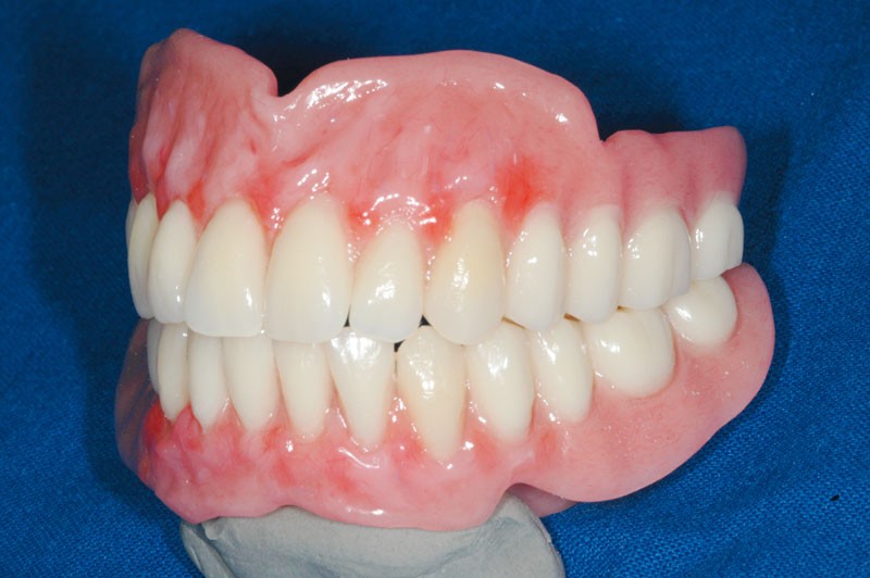 Il réalise ensuite des prothèses standards bimaxillaires en utilisant les dents Pala Premium (Heraeus Kulzer) dans les secteurs antérieurs et postérieurs (fig. 4).