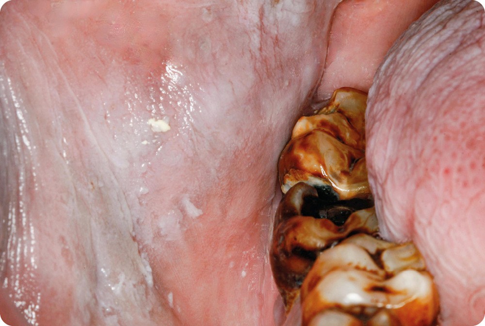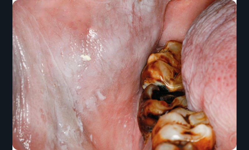 - On était frappé d’emblée par la pigmentation brunâtre recouvrant toutes les dents, certaines en totalité, d’autres partiellement (la face vestibulaire des incisives était peu pigmentée dans la moitié proche du bord incisif). L’ensemble de la muqueuse buccale était recouvert, y compris la langue, par une kératose fine, plus épaisse sur la face interne des joues, où elle pouvait prendre un aspect irrégulier. La kératose était plus marquée sur la ligne occlusale et, sur la joue droite, elle pouvait avoir un aspect grumeleux, voire verruqueux. Les douleurs étaient dues à une carie perforante sur 36.