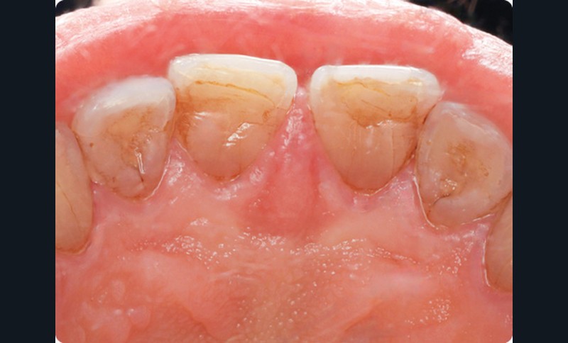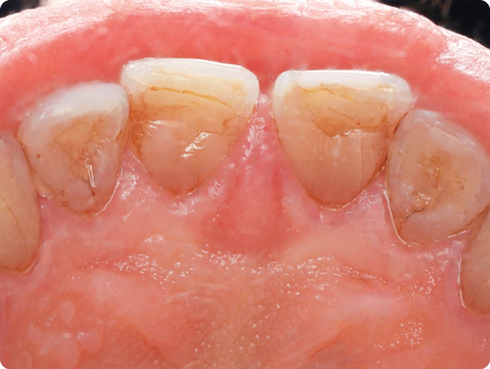 • Dans la région palatine médiane antérieure, on observait une tuméfaction limitée à la papille palatine. Cette dernière, douloureuse à la palpation, était recouverte par une muqueuse érythémateuse. Les dents 11 et 21 étaient vivantes et elles ne présentaient pas d’atteinte parodontale active.