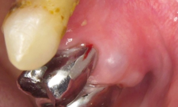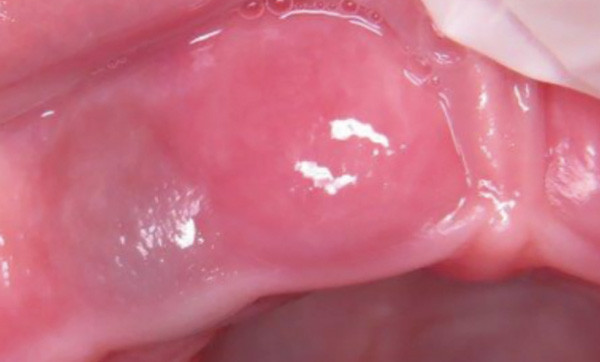 Examen clinique. Il révélait un nodule translucide, légèrement bleuté, de 5 mm de diamètre, situé sur et sous la papille gingivale bordant les 24 et 25. Le nodule était très discrètement dépressible à la palpation avec le dos de la sonde.