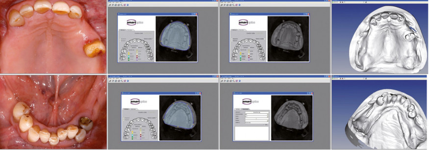 Néanmoins, si une empreinte optique intra-orale semble indiquée dans la réalisation d’une prothèse amovible partielle à châssis métallique pour un édentement encastré de classe III de Kennedy, voire antérieur de classe IV, dans le cas d’édentement important en extension de classe I et II de Kennedy Applegate, la réalisation d’empreinte conventionnelle mucco-statique et dynamique nous semble indispensable avant la numérisation des empreintes ou des modèles secondaires à l’aide de scanner de table (fig. 1).