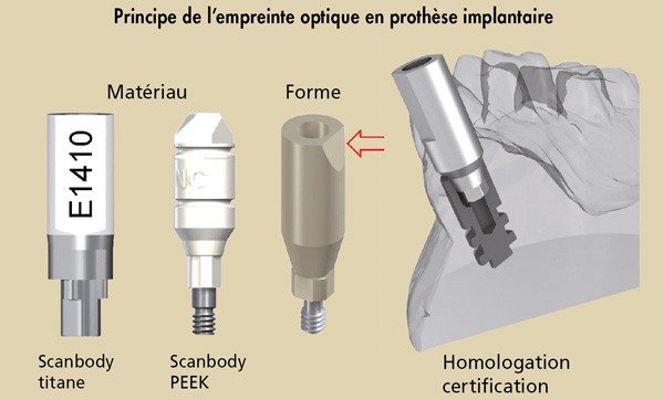 L’empreinte optique intra-orale a été introduite en implantologie dans les années 2000. Son principe consiste à placer un transfert d’empreinte, communément appelé corps de scannage ou « scanbody », de manière vissée ou clipsée au niveau de l’implant. Différents modèles de scanbodies sont proposés, dérivés le plus souvent du laboratoire où ils sont communément utilisés depuis des décennies en CFAO indirecte. Au-delà de la compatibilité, il est nécessaire de veiller à leur certification et à leur homologation afin de lutter contre les risques d’erreurs (fig. 1).