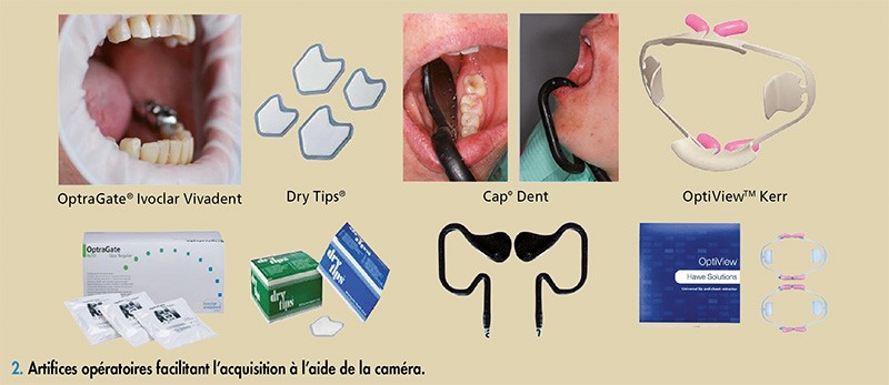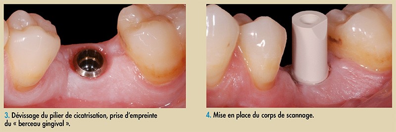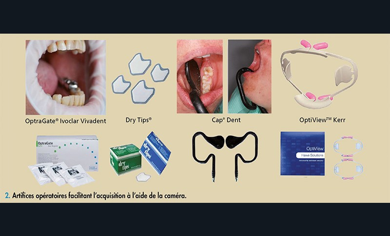 3 mois, l’ostéointégration est vérifiée et contrôlée. Dans un premier temps, le praticien procède à la mise en place d’artifices opératoires pour faciliter l’acquisition à l’aide de la caméra (fig. 2).