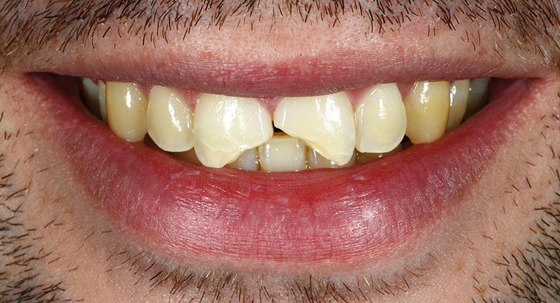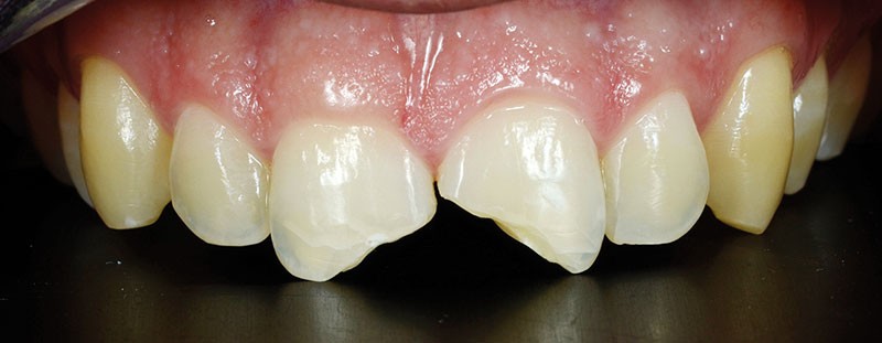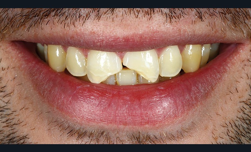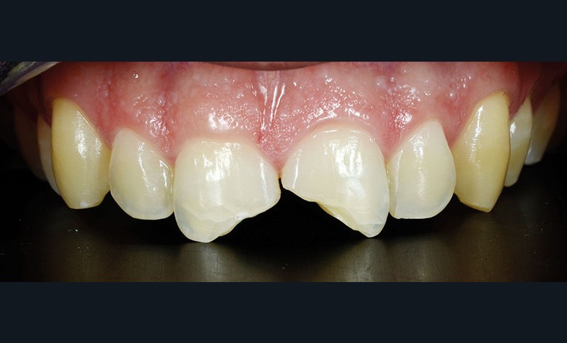 La pulpe dentaire n’est pas exposée et répond positivement aux tests de diagnostic. Les deux dents présentent d’importantes fêlures partant du point d’impact. Le patient souhaite restaurer ses dents au moyen d’une solution fiable, peu mutilante et naturellement esthétique, permettant de conserver leur vitalité.