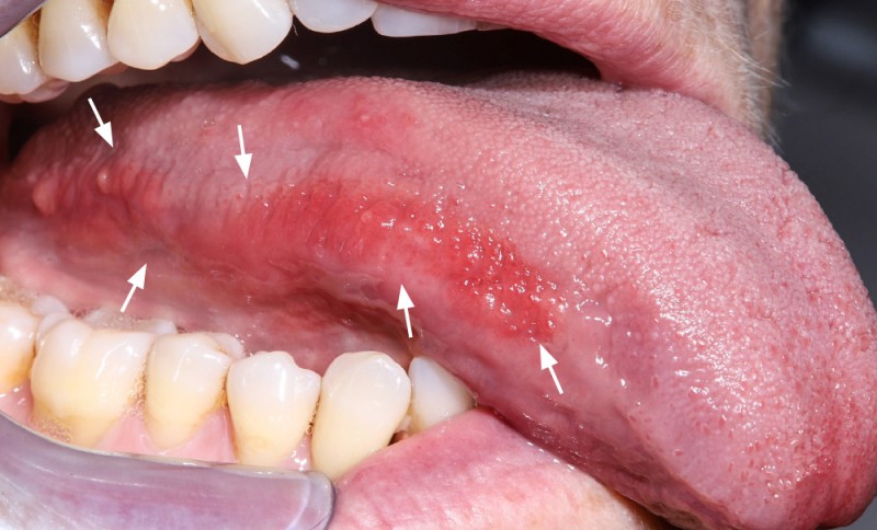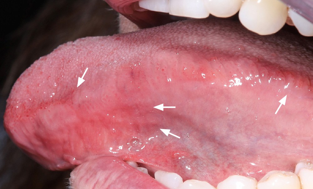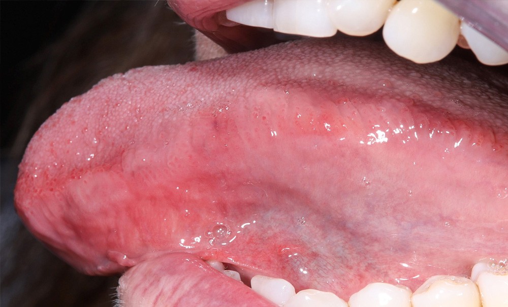 Il n’existe pas d’adénopathie cervicale. L’examen endobuccal révèle la plupart des signes cliniques révélateurs d’une parodontite induite par la plaque, mais également la présence de plages érythémateuses au niveau des bords latéraux de la langue et du plancher lingual antérieur. Ces lésions s’étendent sur plusieurs centimètres de longueur, avec une largeur de 1 à 2 cm ; elles ne sont pas confluentes et présentent des limites nettes. Au toucher, elles sont sensibles et la palpation de la langue ne révèle pas de zones fermes ou indurées. Les autres muqueuses apparaissent saines.