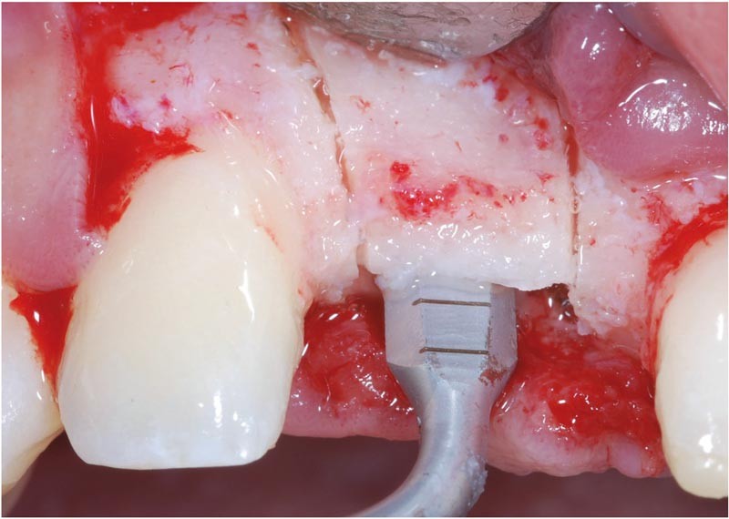 Le principe consiste à réaliser un volet osseux en vestibulaire du site édenté de façon à pouvoir effectuer une expansion de la crête en direction vestibulaire. Une fois cette expansion faite, un forage conventionnel a minima permet la stabilisation primaire de l’implant…