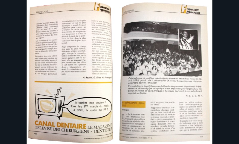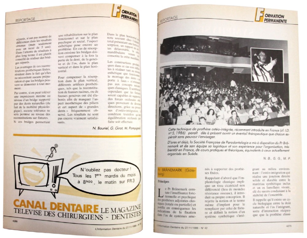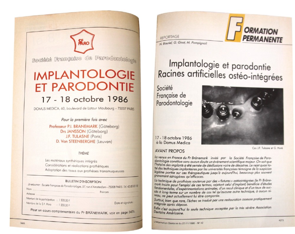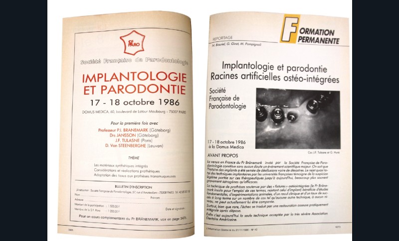 En France, les premiers à prendre le chemin de Göteborg sont Jean-François Tulasne et Guy Huré en 1984 et c’est en 1986 que le Professeur Brånemark est invité en France pour la première fois à l’occasion d’une journée organisée par la Société Française de Parodontologie – elle ne s’appelle pas encore la Société Française de Parodontologie et d’Implantologie Orale.