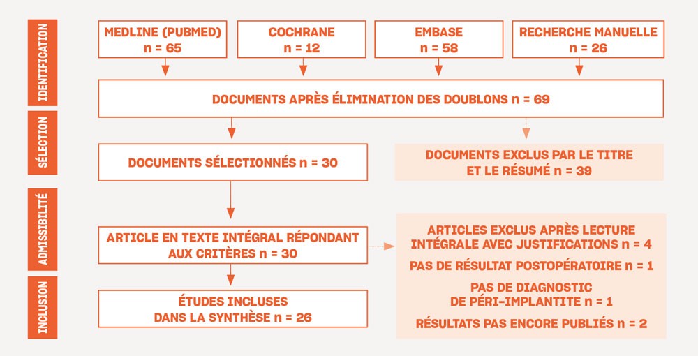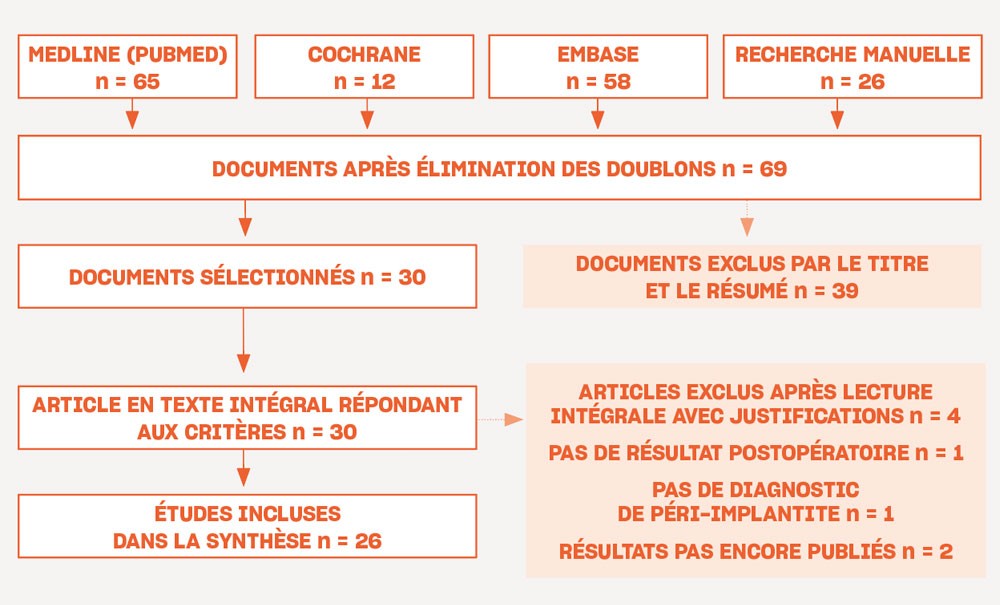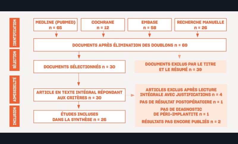 La recherche électronique avec le terme « implantoplasty » a été effectuée sur trois sources (dernière recherche le 1er mars 2021 ; aucune restriction de date utilisée) : MEDLINE (PubMed), Cochrane et Embase. Une recherche manuelle a également été effectuée en examinant la revue systématique sur les complications après procédure d’implantoplastie de Stavropoulos et coll. (2019).