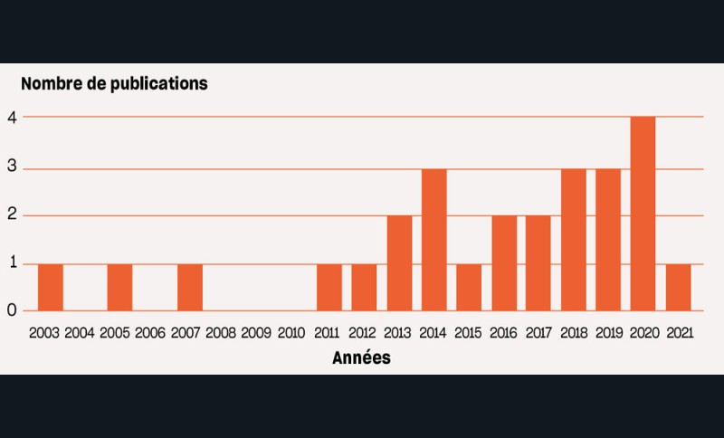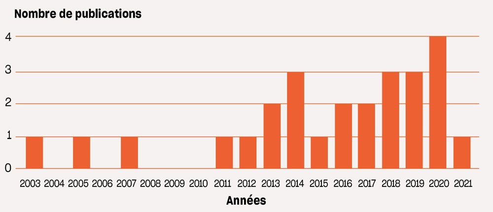 La distribution des études par année de publication (fig. 2) montre que le traitement des maladies péri-implantaires est un sujet d’intérêt croissant, en lien avec une prévalence de plus en plus importante de ces pathologies [32].