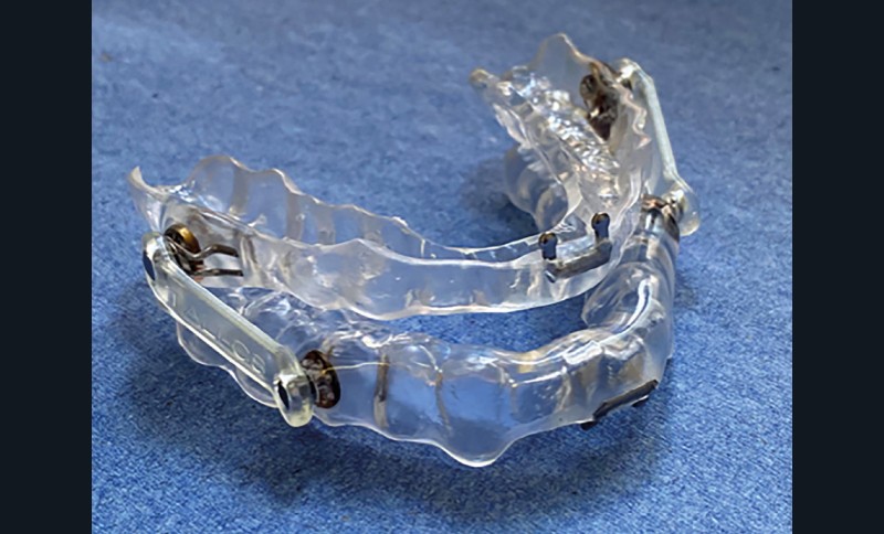L’OAM est un traitement efficace du SAOS. Elle est réglée progressivement jusqu’à l’obtention du meilleur rapport efficacité/tolérance propre à chaque patient. Elle doit donc être « titrable » : l’avancée doit pouvoir être modifiée jusqu’à l’obtention de signes subjectifs d’efficacité, objectivés ensuite par un nouvel examen de sommeil avec le port de l’orthèse (fig. 2). Habituellement, pour être efficace, l’avancée réalisée correspond à 70 %-80 % de la propulsion maximale active (avancée maximale de la mâchoire du patient).