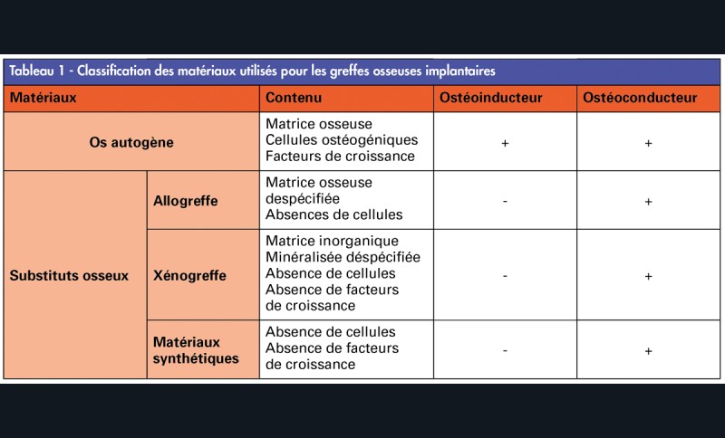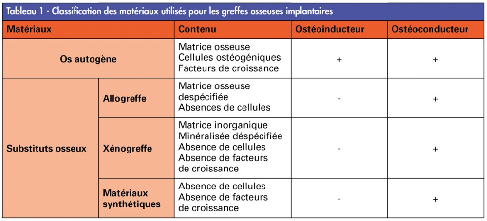 Plusieurs biomatériaux sont disponibles pour la réalisation des greffes osseuses. Il existe deux grandes familles : l’os autogène et les substituts osseux. Selon la Haute Autorité de Santé (HAS), un substitut osseux est « un matériau ostéoconducteur, reprenant partiellement la composition et la fonction de l’os physiologique, avec une capacité de résorption et une fonction mécanique et/ou volumétrique » [3]. Le tableau 1 reprend les classements de ces matériaux en fonction de leurs caractéristiques.