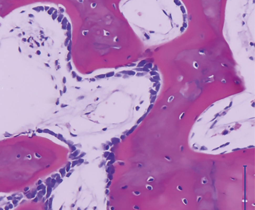L’ostéoblaste actif est une grande cellule cubique, constituée d’un seul noyau, localisé à la surface de l’os. Il est responsable de la formation du tissu osseux et de son remodelage.