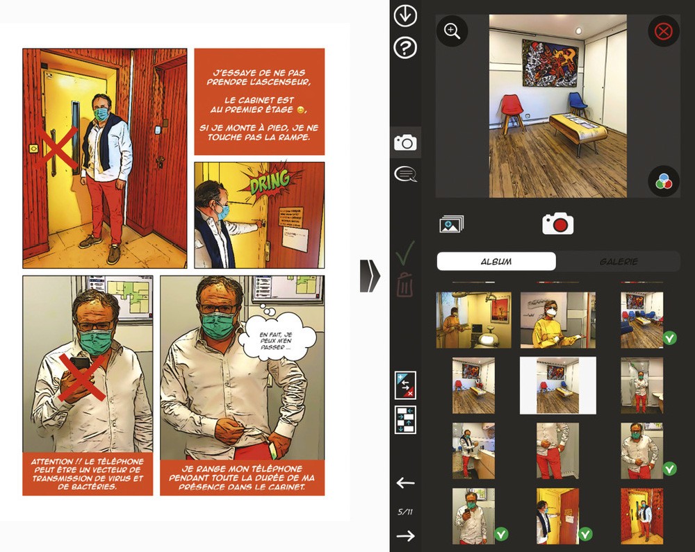 En 2017, j’avais eu l’idée de faire un tutoriel en utilisant une bande dessinée1 : mes patients habitant loin peuvent m’envoyer des photos exploitables pour la surveillance durant la période de contention. Je pense alors à cet outil pour communiquer les consignes de sécurité.