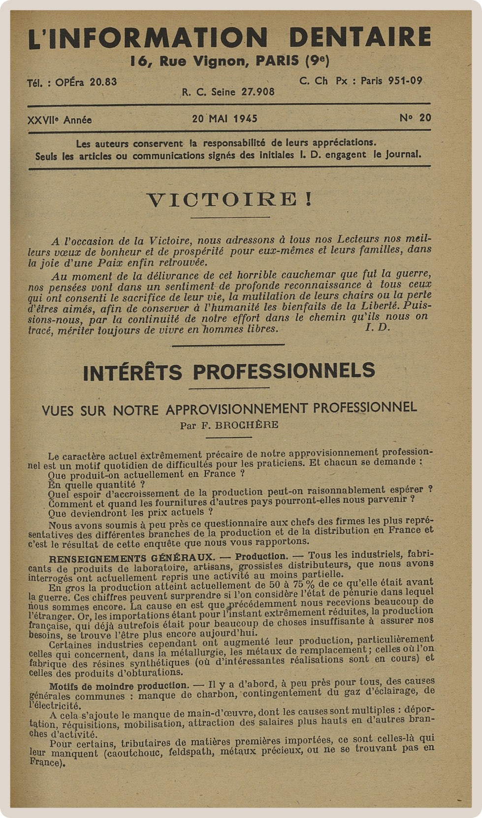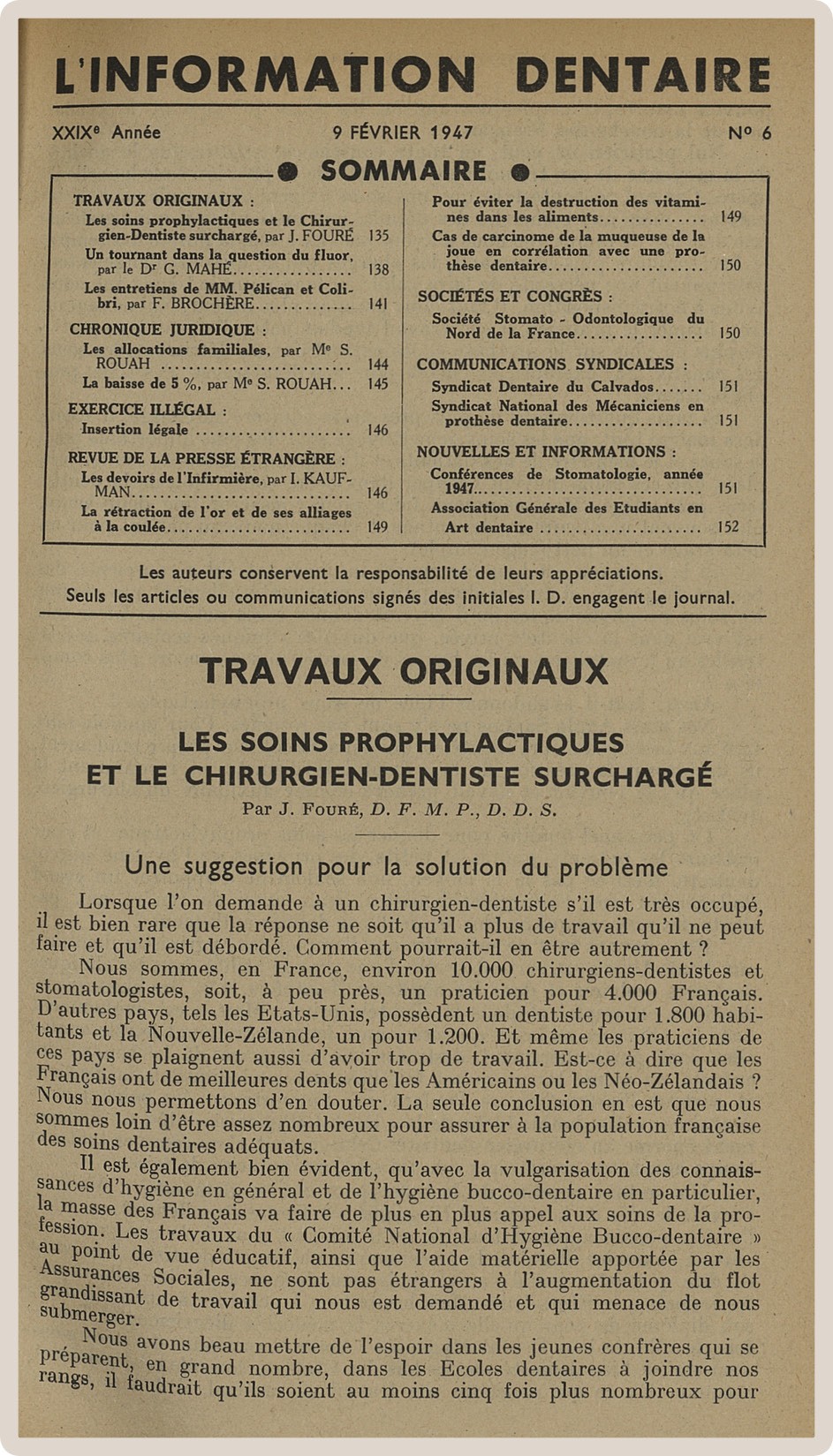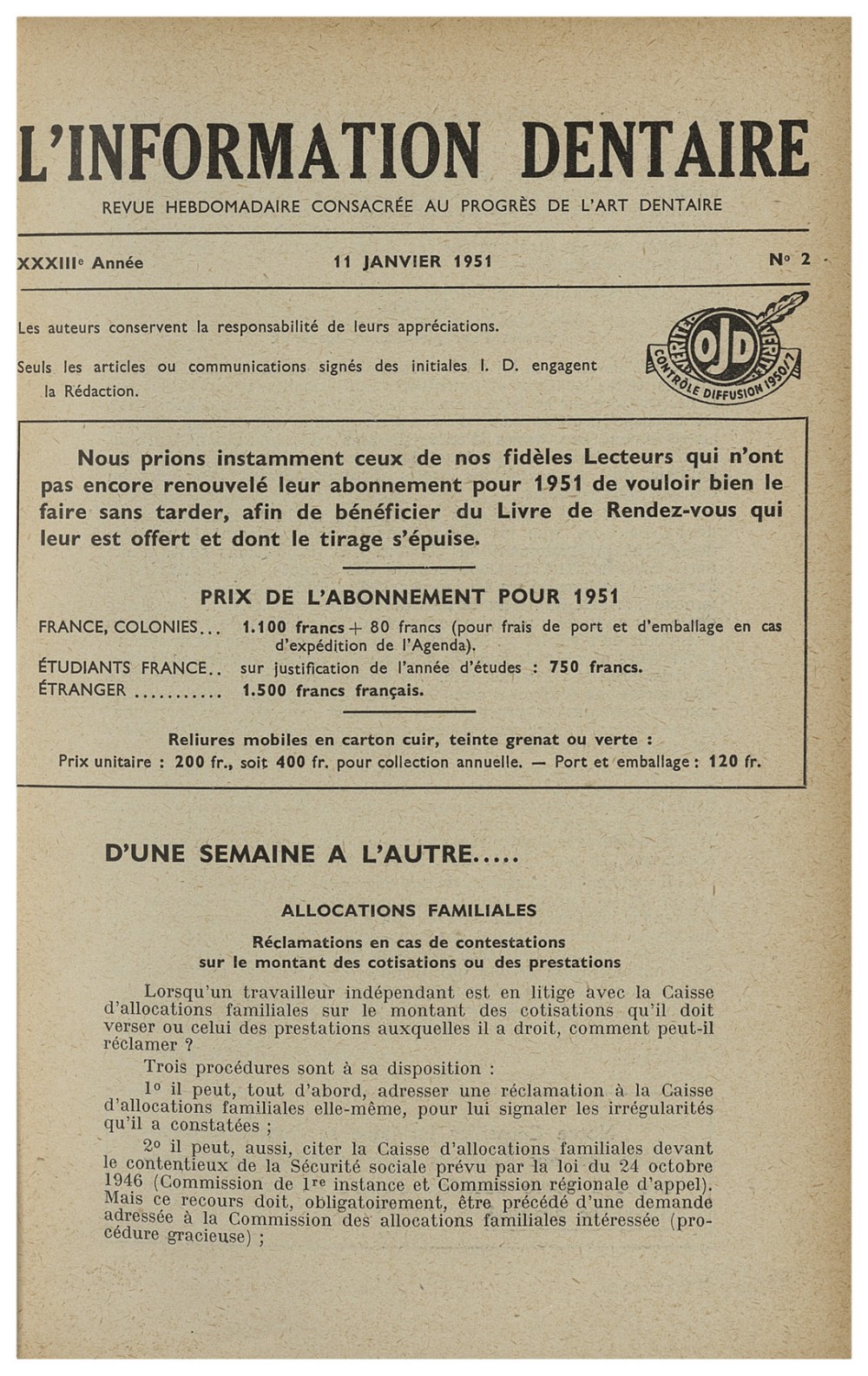 Pendant cette longue vie, L’Information Dentaire a été le témoin de notre profession, de ses évolutions, de ses révolutions. Toujours présente, elle porte en elle le témoignage des moments importants qui ont, parfois insidieusement, transformé notre exercice. Elle nous offre en outre des repères de l’Histoire qui a baigné les vies de nos consœurs et confrères.