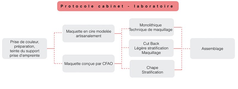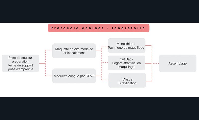 Il existe de nombreuses méthodes de mise en forme de la céramique (pâte crue, pressée, usinage, impression 3D…) avec lesquelles le chirurgien-dentiste n’est pas systématiquement familiarisé. Dans le cadre de cet article, nous décrirons la pressée verticale de céramique (ici le disilicate de lithium) que nous réalisons quotidiennement dans notre laboratoire de prothèse. La pressée est une technique qui reprend celle de la cire perdue. La maquette en cire peut être confectionnée artisanalement ou par CFAO. Elle reproduira l’intégralité du volume de la restauration avant un maquillage superficiel (monolithique) ou un maquillage en profondeur après retrait d’une partie de la céramique (cut back) ou sera limitée à une chape émaillée secondairement. Les étapes cliniques et de laboratoire sont ainsi illustrées par la figure 1.