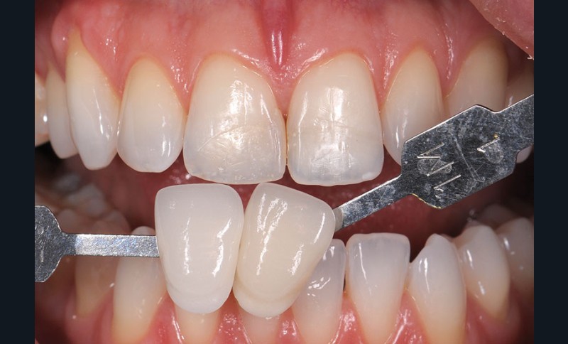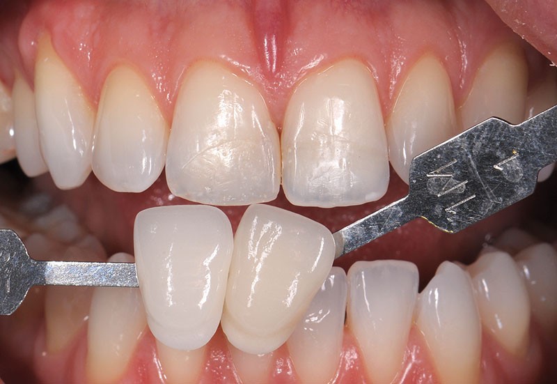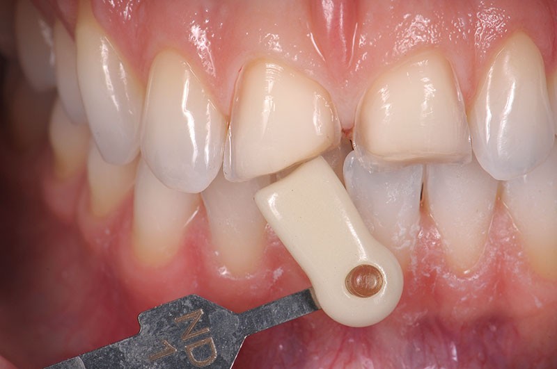 Le praticien réalise le relevé de couleur des dents naturelles (fig. 2 et 3) puis prend les empreintes nécessaires.