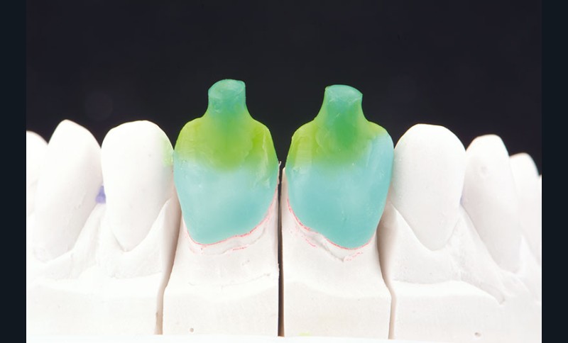 Les chapes homothétiques sont réalisées (fig. 5) conformément au protocole du fabricant (Ivoclar-Vivadent) et, dans ce cas précis, par la technique du CPC [1].
